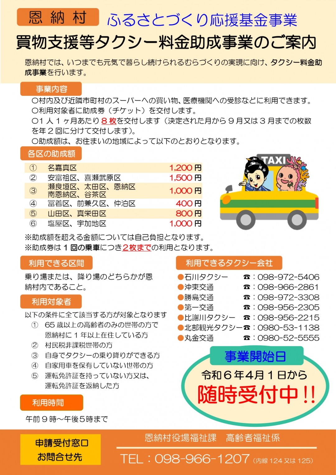 高齢になっても安心して暮らし続けられる村づくりの実現に向け、自らの移動手段の確保が困難な高齢者がタクシーを利用する場合において、その料金の一部を助成する買物支援等タクシー料金助成事業を行います。2、事業内容