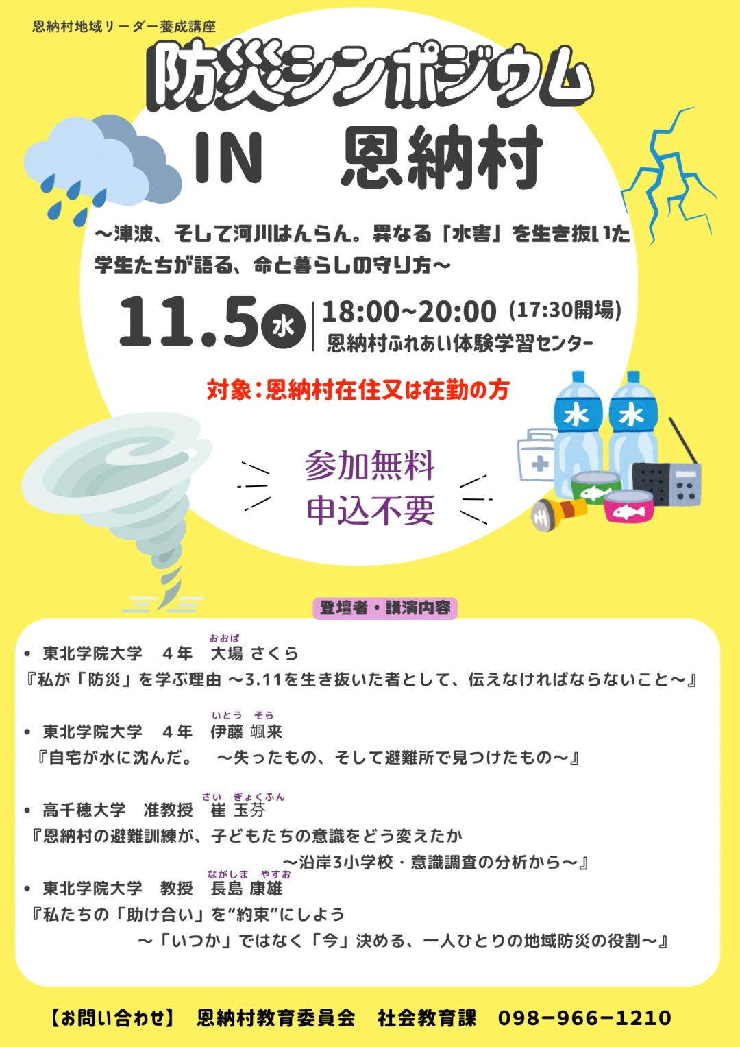 ホーム 新着情報 「防災シンポジウム in 恩納村」の開催について 「防災シンポジウム in 恩納村」の開催について 最終更新日:2025年10月20日 近年、全国各地で頻発する大雨・河川はんらんや津波などの水害は、海抜の低い場所の多い恩納村でも他人事ではありません。 今一度、水害への備えについて一緒に考えてみませんか? 恩納村在住・在勤の方はどなたでも参加できます!入場無料です。 最近の記事 2025年10月20日 「防災シンポジウム in 恩納村」の開催について 2025年10月17日 介護に関する入門的研修の受講者募集 2025年10月16日 令和8年度北部広域市町村圏事務組合職員採用候補者試験実施案内について 2025年10月16日 公募型プロポーザル審査結果について(恩納村農水産物販売センター周辺可能性調査業務) 2025年10月14日 生涯学習講座「子どものしつけ」について アーカイブ 2025年(93) 2025年10月(12) 2025年09月(8) 2025年08月(11) 2025年07月(5) 2025年06月(10) 2025年05月(11) 2025年04月(9) 2025年03月(8) 2025年02月(9) 2025年01月(10) 2024年(125) 2023年(96) 2022年(110) 2021年(121) 2020年(105) 2019年(45) 2018年(50) 2017年(48) 2016年(23) 2015年(1)