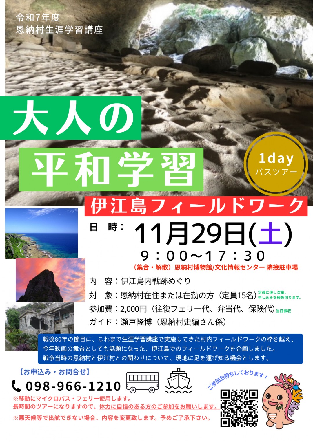 ホーム 新着情報 生涯学習講座「大人の平和学習」伊江島フィールドワーク 生涯学習講座「大人の平和学習」伊江島フィールドワーク 最終更新日:2025年10月28日 戦後80年の節目に、これまで生涯学習講座で実施してきた村内フィールドワークの枠を越え、今年映画の舞台としても話題になった、伊江島でのフィールドワークを企画しました。 戦争当時の恩納村と伊江村との関わりについて、現地に足を運び、知る機会とします。 最近の記事 2025年10月28日 生涯学習講座「大人の平和学習」伊江島フィールドワーク 2025年10月28日 生涯学習講座「お金持ちになる方法」(全3回) 2025年10月26日 令和7年度 恩納村博物館講座「トウツルモドキでカゴ作り」参加者募集のお知らせ(博物館HPへ移動します) 2025年10月21日 恩納多目的広場修繕工事に伴う使用禁止について 2025年10月20日 【国勢調査】回答が確認できていない世帯へチラシを配布しています アーカイブ 2025年(98) 2025年10月(17) 2025年09月(8) 2025年08月(11) 2025年07月(5) 2025年06月(10) 2025年05月(11) 2025年04月(9) 2025年03月(8) 2025年02月(9) 2025年01月(10) 2024年(125) 2023年(96) 2022年(110) 2021年(121) 2020年(105) 2019年(45) 2018年(50) 2017年(48) 2016年(23) 2015年(1)