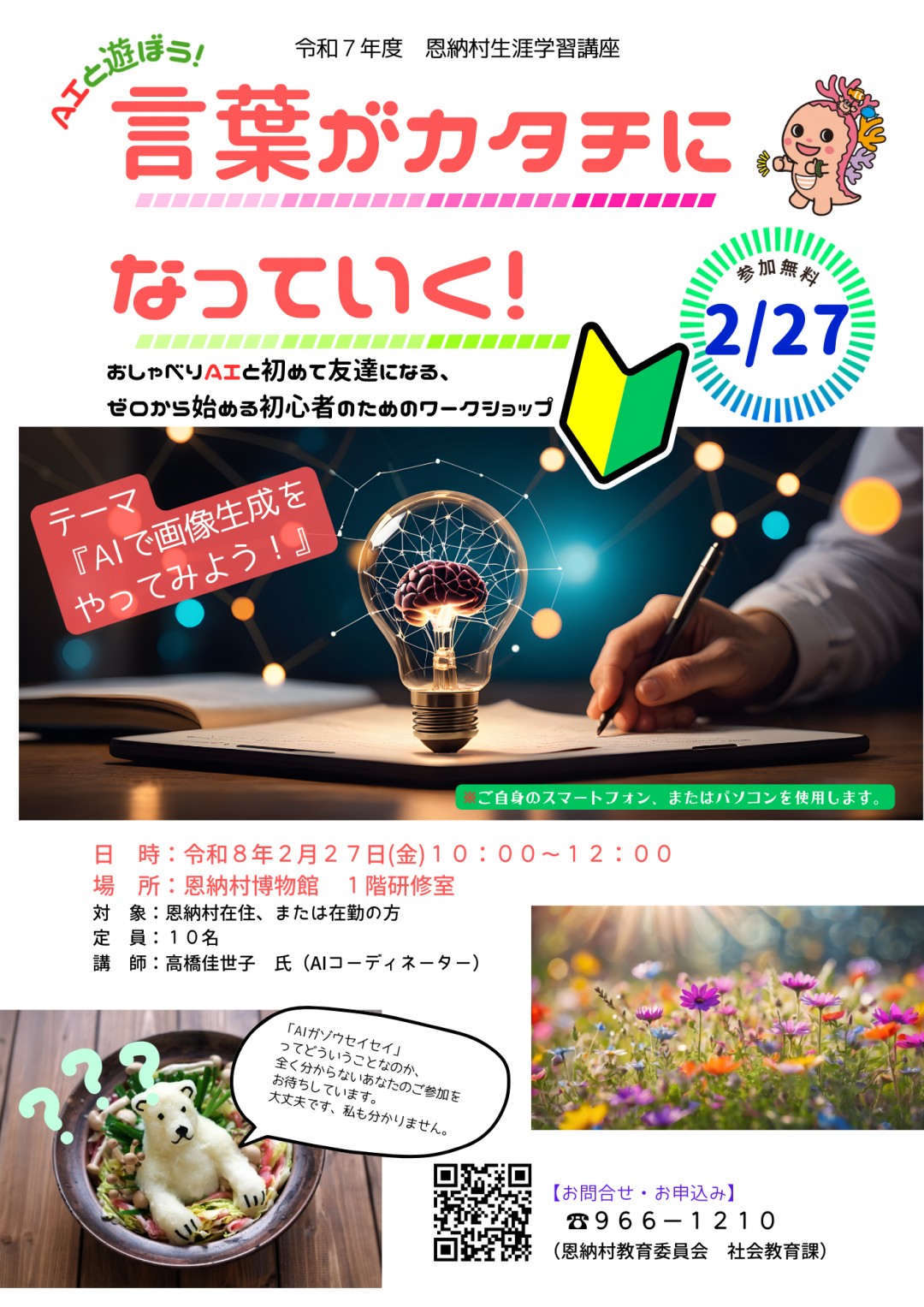 ホーム 新着情報 生涯学習講座「AIと遊ぼう!言葉がカタチになっていく!」 生涯学習講座「AIと遊ぼう!言葉がカタチになっていく!」 最終更新日:2026年01月20日 ゼロから始める初心者のためのワークショップ、テーマは「AI画像生成をやってみよう!」です。 興味はあるけれどく分からない・・・というあなたのご参加、お待ちしています!おしゃべりAIと友達になって、いつもと違う世界をのぞいてみませんか? 最近の記事 2026年01月20日 生涯学習講座「AIと遊ぼう!言葉がカタチになっていく!」 2026年01月20日 令和8年度中部北環境施設組合会計年度任用職員募集案内 2026年01月20日 サンゴの村フェスタ2026 開催!! 2026年01月14日 【注意喚起】消費者庁職員を騙る不審な電話にご注意ください〜外部リンクへ移動します〜 2026年01月12日 システム標準化に伴う各種帳票等の変更について(令和8年1月13日より) アーカイブ 2026年(9) 2026年01月(9) 2025年(104) 2024年(124) 2023年(96) 2022年(110) 2021年(121) 2020年(105) 2019年(45) 2018年(50) 2017年(48) 2016年(23) 2015年(1)