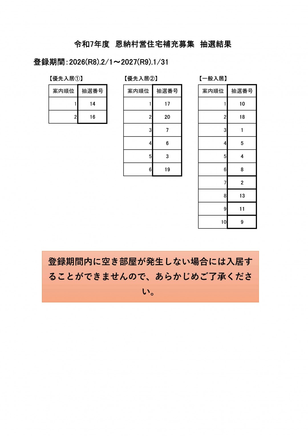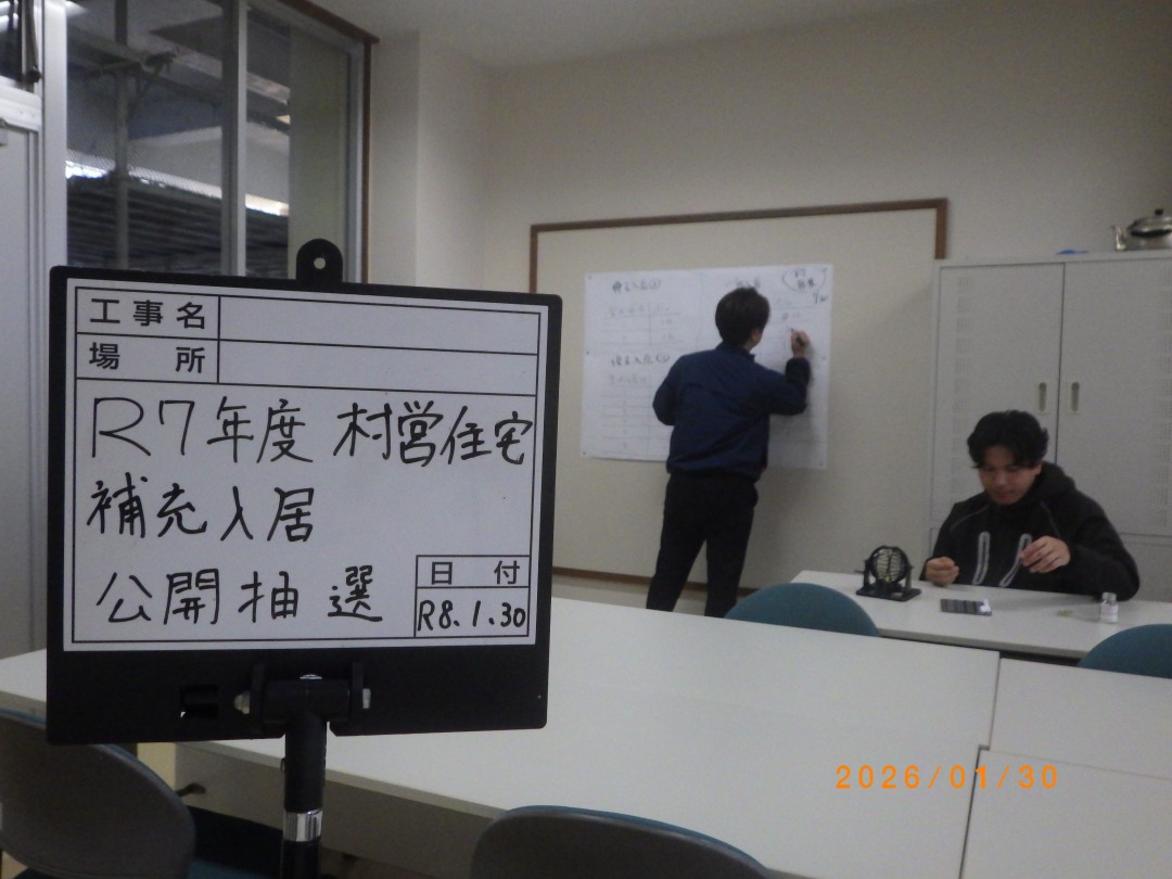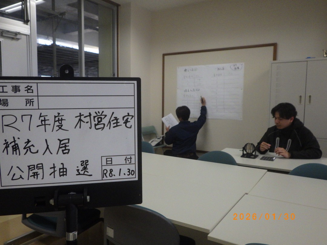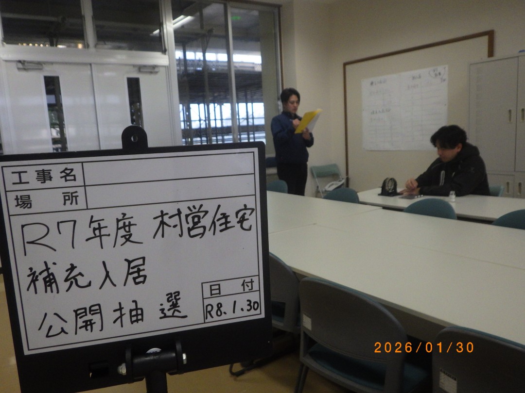 ホーム 暮らしの情報 引越し・住まい 公営住宅 令和7年度 恩納村営住宅補充募集抽選結果について 令和7年度 恩納村営住宅補充募集抽選結果について 令和8年1月30日に実施した恩納村営住宅補充入居者抽選の結果を以下のとおりお知らせします。 抽選の様子 PDFを閲覧・印刷するにはAdobe Readerが必要です。 Adobe Readerのダウンロードはこちら(別ウィンドウ)から(無償) このページは建設課が担当しています。 〒904-0492 沖縄県国頭郡恩納村字恩納2451番地 TEL:098-966-1203 問い合せはこちらから 暮らしの情報 各種届出・申請 妊娠・出産 子育て支援 教育委員会 結婚・離婚・死亡 引越し・住まい 転入届 転出届 転居届 公営住宅 恩納村公営住宅等長寿命化計画 令和7年度 村営住宅補充(空家待ち)入居者募集について 令和7年度 恩納村営住宅補充募集抽選結果について 上下水道 高齢者・介護 税金 年金・保険 暮らし・環境 障がい・福祉 健康・健診 就職・退職 おくやみ マイナンバーカードについて 各種相談 防災・防犯 恩納村 めがね購入費援助事業について