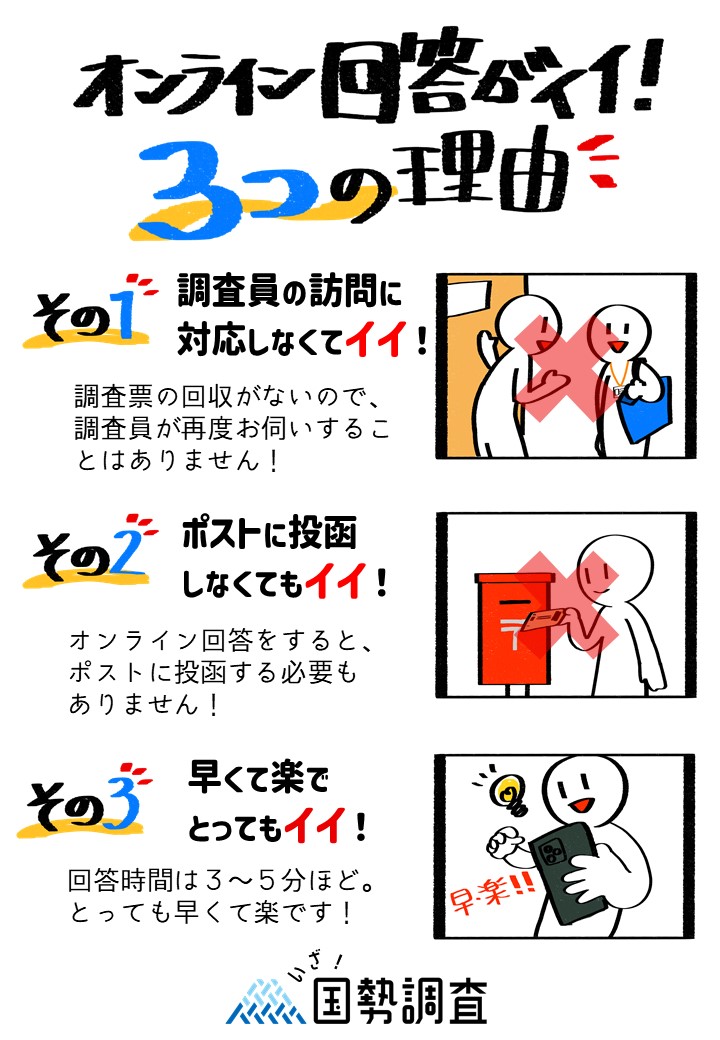 インターネット回答をしていただくと、調査員が再度訪問することもなく、返送用の封筒でポストインする必要もなし。