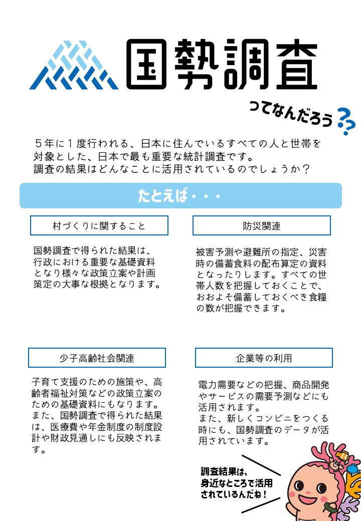 日本に住むすべての人と世帯(外国籍の皆さんも含む)が対象となる、5年に1度の最も重要な統計調査です。国勢調査は、国内の人及び世帯の実態を把握し、各種行政施策その他の基礎資料を得ることを目的としています。第1回調査は1920年(大正9年)に行われ、2025年(令和7年)調査は22回目に当たります。国勢調査で得られた結果は、大切な行政資料の基礎となり、村づくりの様々な部分で活用されます。