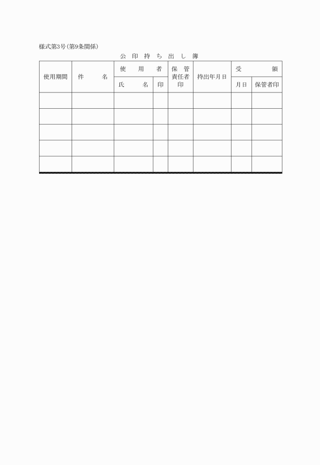 3 公印を持ち出し使用する場合は、公印持ち出し簿(様式第3号)に必要事項を記入の上、保管者の承認を得るものとし、使用後は、速やかに保管者に返納しなければならない。