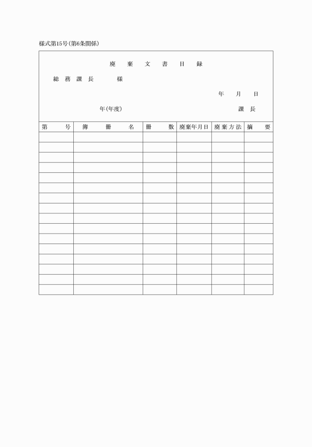 第39条 主管課長は、毎年8月31日までに保存期間の満了した文書を調査し、種別、冊数等を文書廃棄台帳に登記の上、総務課長に合議し、廃棄処分しなければならない。
