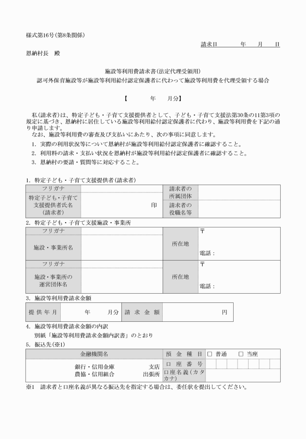 認可外保育施設、預かり保育事業、一時預かり事業、病児保育事業、子育て援助活動支援事業(法第7条第10項第4号、第5号、第6号、第7号、第8号に規定する施設) | 【法定代理受領の場合】 ・施設等利用費請求書(法定代理受領用)(様式第16号) ・施設等利用費請求金額内訳書(法定代理受領用)(様式第16号の2) 【償還払いの場合】 ・施設等利用費請求書(償還払い用)(様式第17号) | ・特定子ども・子育て支援の提供に係る領収証(様式第18号) ・活動報告書(子育て援助活動支援事業に限る。) ・その他村長が必要と認めた書類 |