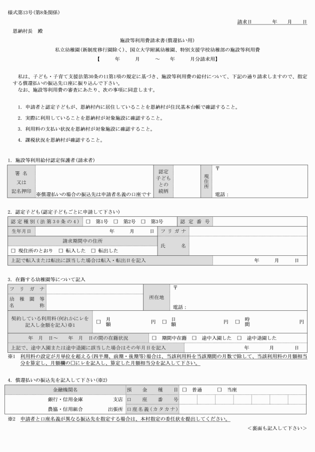 認定こども園、幼稚園、特別支援学校(法第7条第10項第1号、第2号、第3号に規定する施設) | 【法定代理受領の場合】 ・施設等利用費請求書(法定代理受領用)(様式第12号) ・施設等利用費請求金額内訳書(法定代理受領用)(様式第12号の2) 【償還払いの場合】 ・施設等利用費請求書(償還払い用)(様式第13号) | ・特定子ども・子育て支援の提供に係る領収証(様式第14号) ・特定子ども・子育て支援の提供に係る提供証明書(様式第15号) ・その他村長が必要と認めた書類 |