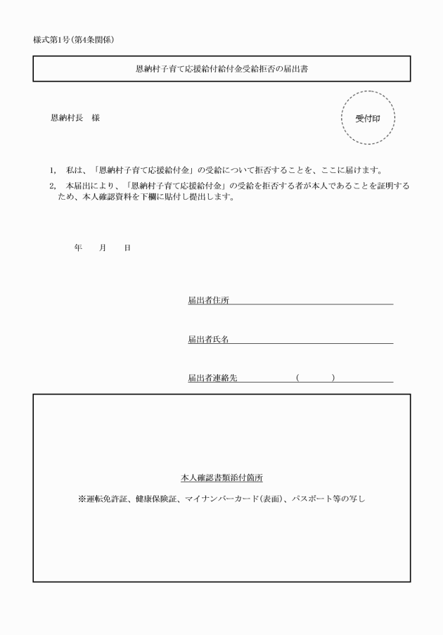 第4条 村長は、本給付金の支給の通知を行い、受給の意向を確認したうえで、本給付金の支給を決定する。支給対象者は、支給を希望しない場合は、様式第1号の給付金受給拒否の届出書により届け出を行う。