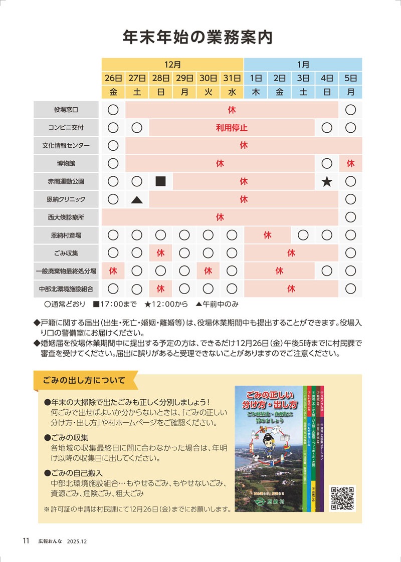ホーム 新着情報 12月広報誌(ごみ収集)の誤りについて 12月広報誌(ごみ収集)の誤りについて 最終更新日:2025年12月03日 年末年始業務案内のごみ収集の記載について1月4日(日)ごみ回収ありと表記しておりましたが正しくは回収が ありませんのでお知らせします。 ご迷惑をおかけして申し訳ありませんがよろしくお願いいたします。 最近の記事 2025年12月04日 通信販売に関する注意喚起 2025年12月03日 12月広報誌(ごみ収集)の誤りについて 2025年12月02日 令和7年度 恩納村アジア圏内文化・交流体験プログラム派遣事業の報告について 2025年12月02日 セグロウリミバエの緊急防除 北部離島追加および期間延長(R9.3.31まで) 2025年12月01日 窓口業務システムの標準化に伴うコンビニ交付サービスの停止について アーカイブ 2025年(109) 2025年12月(7) 2025年11月(10) 2025年10月(12) 2025年09月(7) 2025年08月(11) 2025年07月(5) 2025年06月(10) 2025年05月(11) 2025年04月(9) 2025年03月(8) 2025年02月(9) 2025年01月(10) 2024年(124) 2023年(96) 2022年(110) 2021年(121) 2020年(105) 2019年(45) 2018年(50) 2017年(48) 2016年(23) 2015年(1)
