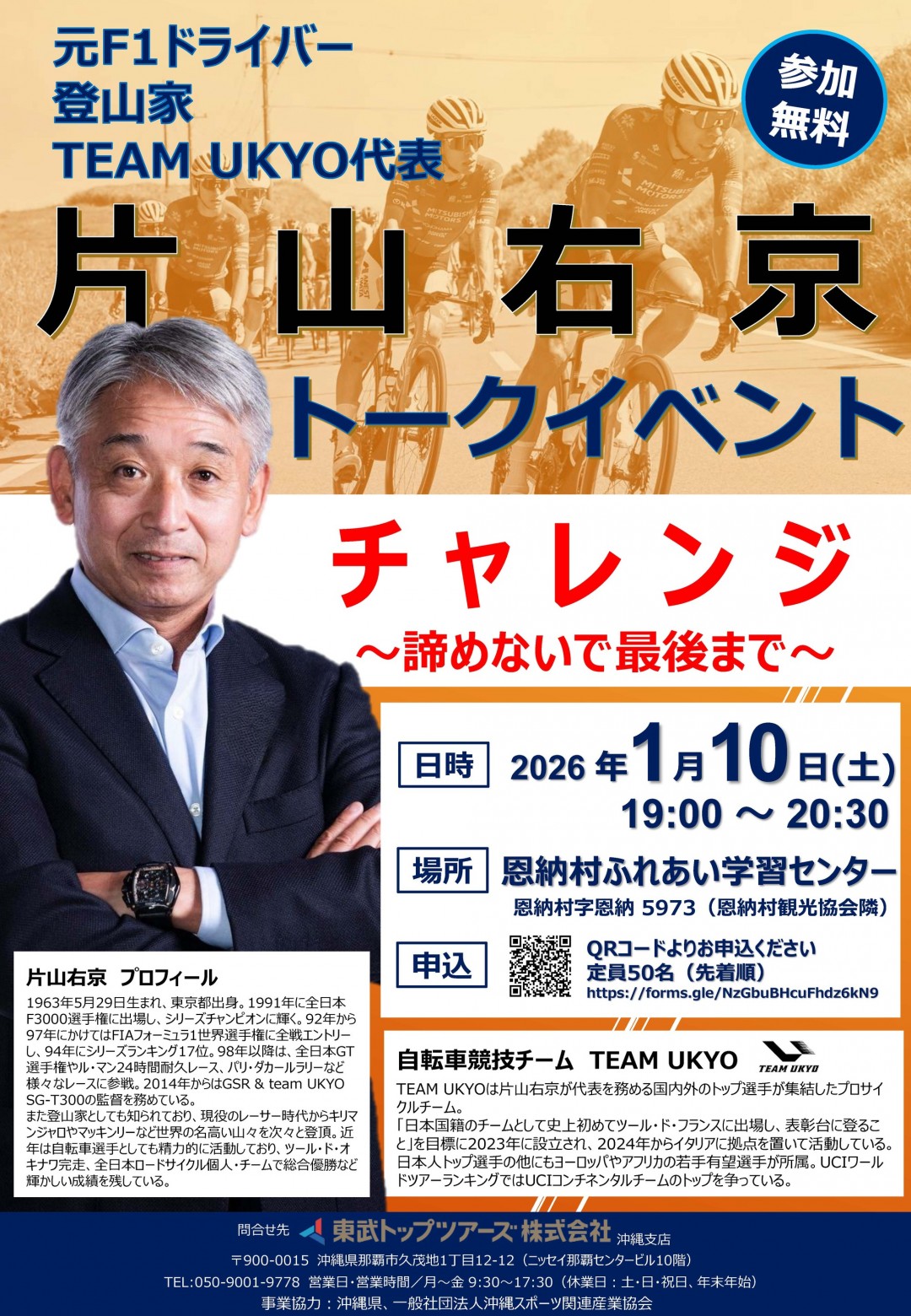 ホーム 新着情報 元F1ドライバー 片山右京氏トークイベント開催! 元F1ドライバー 片山右京氏トークイベント開催! 最終更新日:2025年12月25日 プロサイクルチーム「TEAM UKYO」 監督 片山右京氏 トークイベント:チャレンジ〜諦めないで最後まで〜 日時:2026年1月10日(土) 場所:恩納村ふれあい体験学習センター 申し込みは下記申し込みフォームから 申し込みフォーム 最近の記事 2025年12月26日 恩納村生涯学習講座「大人の平和学習」座学&2つのフィールドワーク 2025年12月25日 恩納村リーフチェック チーム科学者養成講座2026の参加者募集について 2025年12月25日 元F1ドライバー 片山右京氏トークイベント開催! 2025年12月22日 川崎フロンターレサッカー教室開催&沖縄キャンプ2026について 2025年12月22日 【1月24日開催】 ウォーキングフェスタ アーカイブ 2025年(111) 2025年12月(16) 2025年11月(10) 2025年10月(9) 2025年09月(6) 2025年08月(10) 2025年07月(5) 2025年06月(10) 2025年05月(10) 2025年04月(9) 2025年03月(8) 2025年02月(9) 2025年01月(9) 2024年(124) 2023年(96) 2022年(110) 2021年(121) 2020年(105) 2019年(45) 2018年(50) 2017年(48) 2016年(23) 2015年(1)